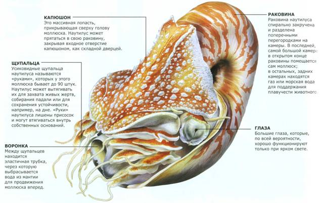 Современные наутилусы - небольшие донные животные, не превосходящие 200 мм. Перламутровая раковина наутилуса разделена на секции. Заполняя эти секции газом или водой. животное регулирует плавучесть своего кораблика. Недаром свой корабль капитан Немо из известного романа Жюля Верна назвал Наутилусом. ( Для многих название моллюска скорее ассоциируется с музыкальной группой ).